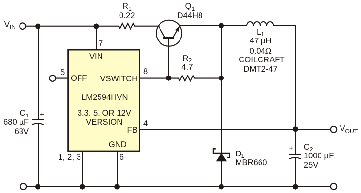 Figure 1. Less expensive than a "brick" converter, this circuit accommodates high input voltages and output currents