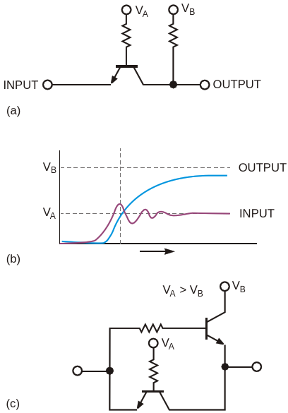 Figure 2. Level translation in one direction requires half of the open-drain translation circuit (a). For a low-to-high transition, RC effects do not appear until the output rises to about 0.5 V below the lower supply voltage (b). The circuit also works for transla