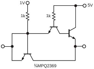 The ultimate 1-to-5V up-shifting driver in the laboratory produces a symmetrical delay of 6 nsec using three-fourths of an MPQ2369 when driving a single 74AC541 buffer