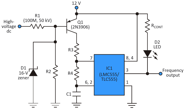 As shown, the dc high-voltage drop detector/undervoltage alarm uses an LED for a visible indication, but the LMC555/TLC555 can also be connected to a speaker for an audible alarm