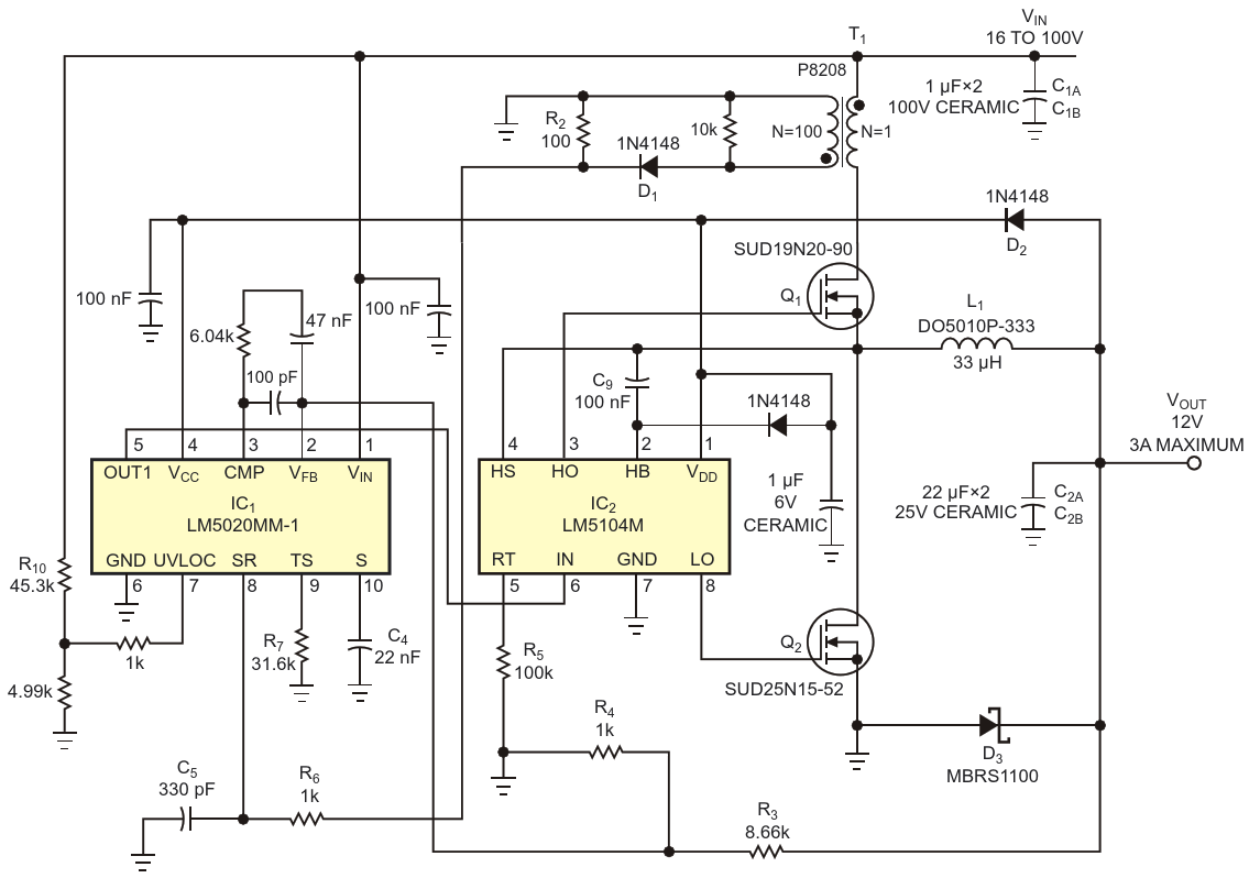 Wide-range regulator delivers 12V, 3A output from 16 to 100V source