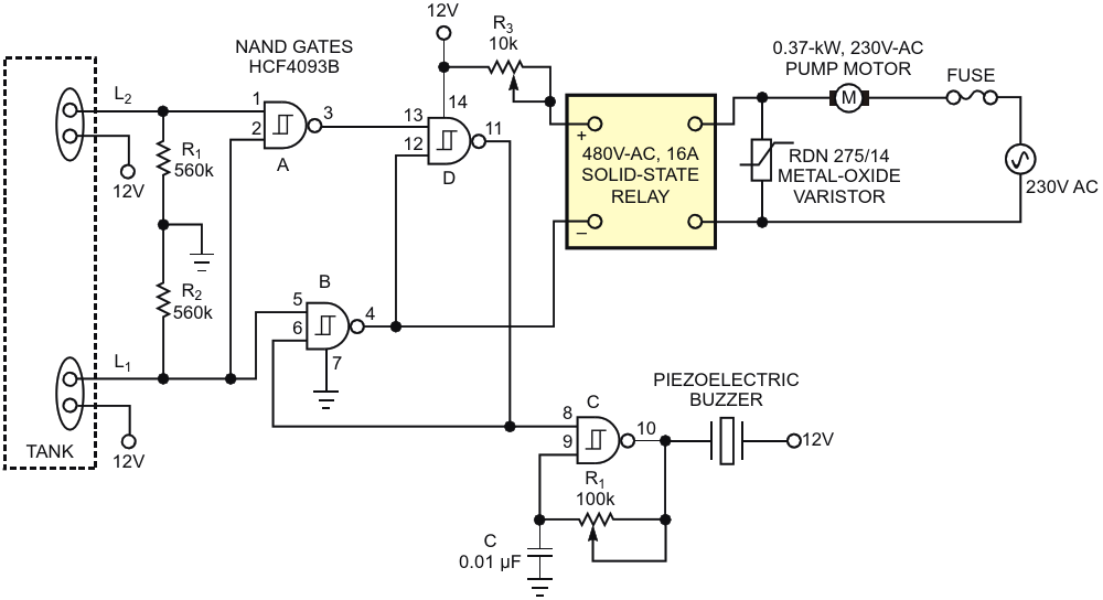 A sump-pump controller uses a quad-NAND gate to drive a solid-state relay