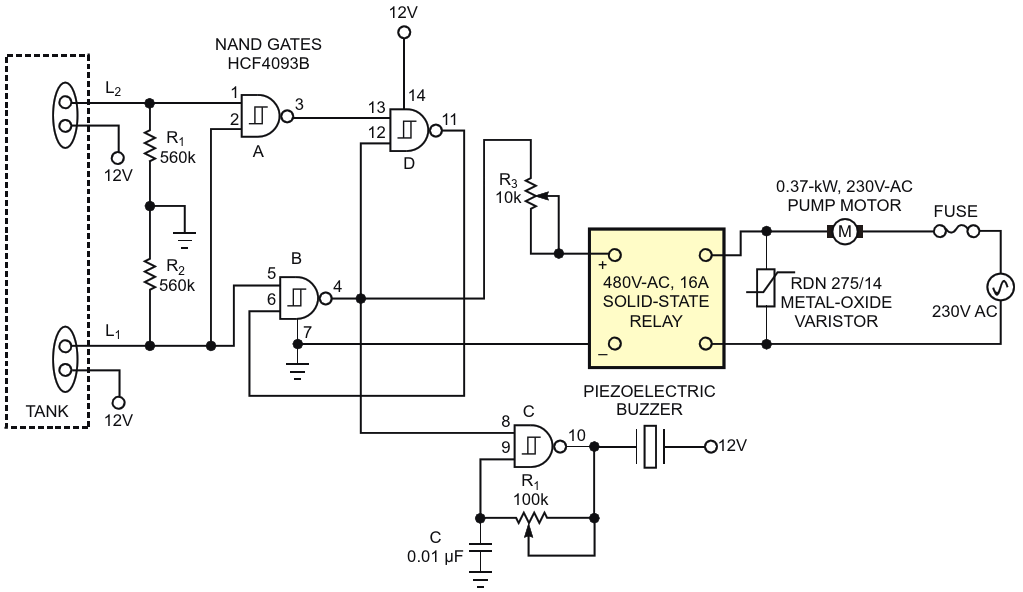 Figure 1. A sump-pump controller uses a quad-NAND gate to drive a solid-state relay