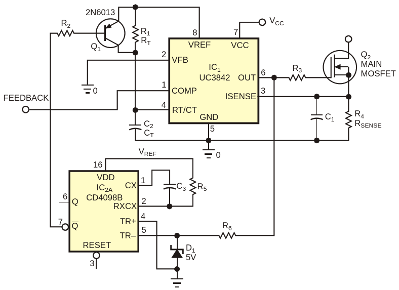 This resonant flyback configuration uses only a controller IC and a one-shot multivibrator