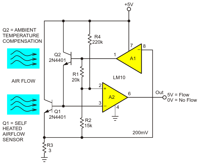 Self-heated Darlington transistor pair comprises new air flow sensor