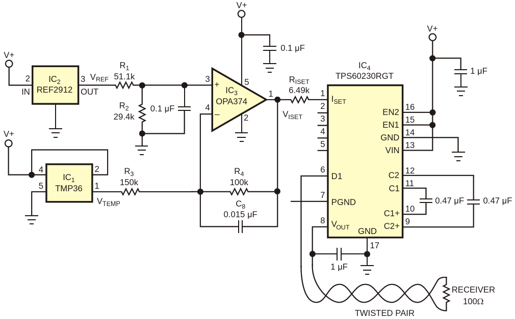 In this circuit, the LED driver drives the 4- to 20-mA current loop proportionate to a sensed temperature of -10 °C at 4 mA and 50 °C at 20 mA