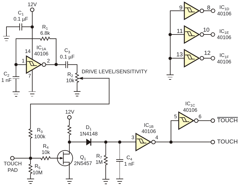 A low-cost touch-switch interface uses three Schmitt trigger hex inverters and a single JFET per channel