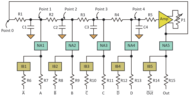 Figure 1. The fixed-frequency, fixed-multiphase generator uses repetitive blocks to provide stepped phase differences relative to the original waveform