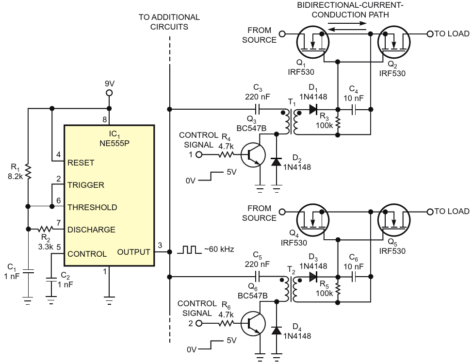 A single 555 oscillator provides square-wave ac gate drive to an array of as many as 15 MOSFET-based solid-state relays