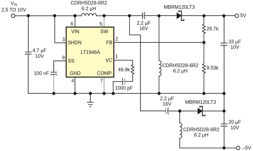 Figure 1. A simple circuit produces -5 V from a single positive input without the need for a transformer