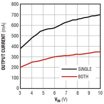 This graphic shows maximum output current versus input voltage for both outputs or a single output