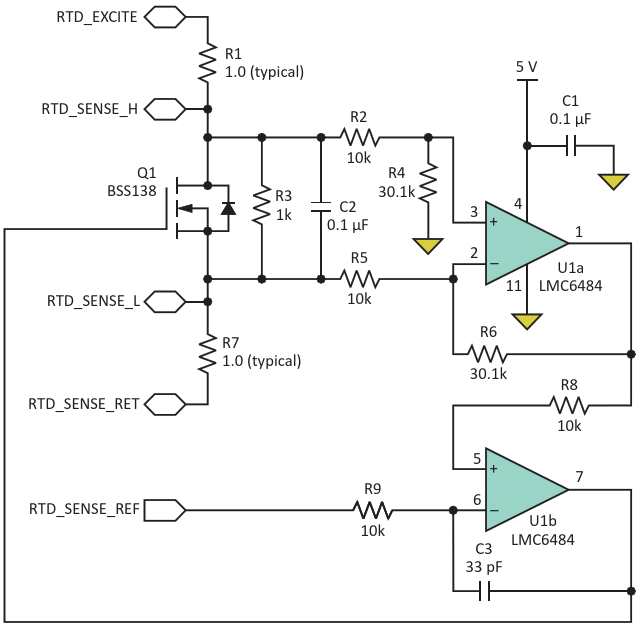 Figure 3. In the RTD emulator, Q1 (an N-channel logic-level enhancement-mode FET) is the active component that provides the controllable voltage to emulate the RTD