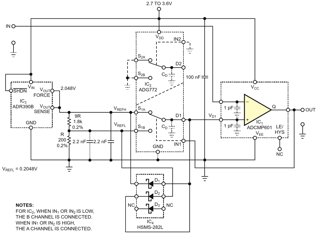 Figure 2. Schottky barrier diode D1 damps positive voltage spikes that occur at the noninverting input of comparator IC1 shortly after the high-to-low transition of the output voltage. Diode D2 clamps the negative excursion of the r
