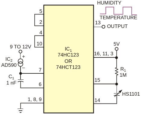 A monostable-multivibrator IC provides temperature and humidity information in one TTL signal