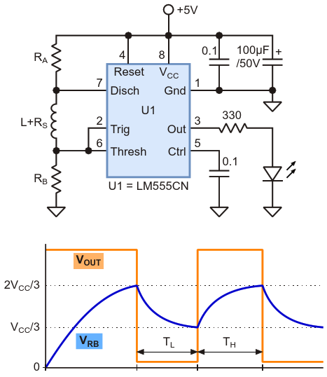 A 555 multivibrator circuit that uses inductor-resistor values