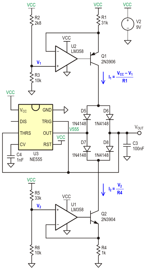 Figure 3. Schematic of triangle/sawtooth wave generator with an LM358 and two transistors used as current sources