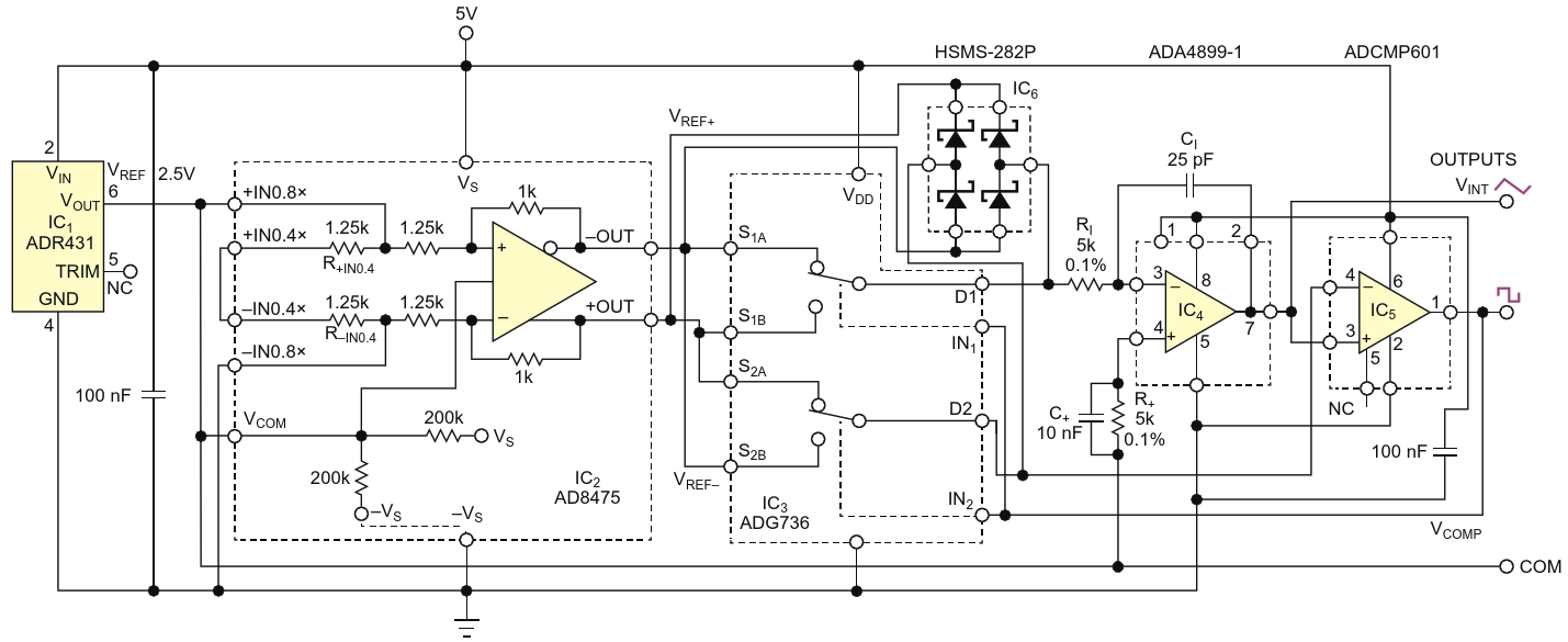 Creating hysteresis by switching precision reference voltages within the waveform generator ensures high insensitivity of the amplitude of triangular waveforms on supply-voltage variations