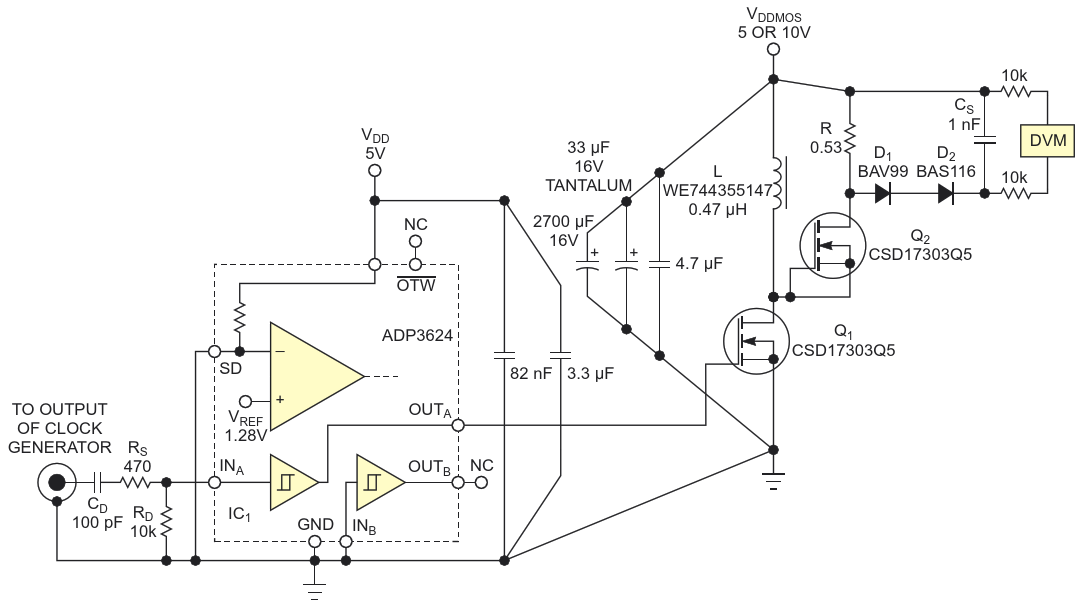 The test setup allows you to operate a MOSFET power switch at a fixed turn-on time. The power circuit remains cool with a 10-kHz repetition rate, even at peak inductor currents of tens of amperes