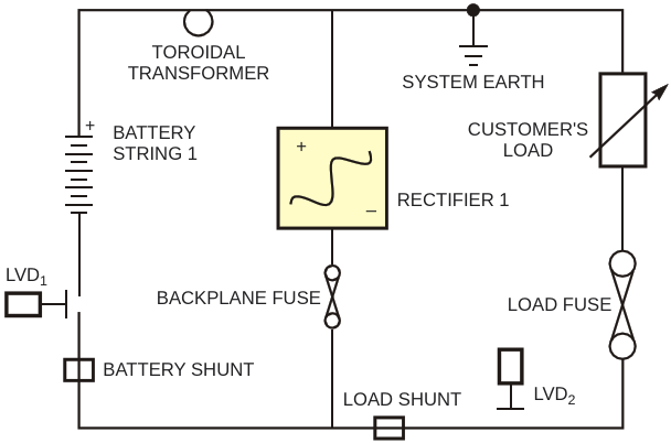 Figure 2. The system wiring diagram shows transformer T1's primary winding. Low-voltage-disconnect units LVD1 and LVD2 isolate the 48 V battery or the customer's load for maintenance