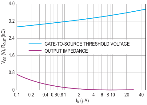 A plot of key parameters - gate-to-source voltage and output impedance -versus drain current shows smoothness of variation over two and one- half decades