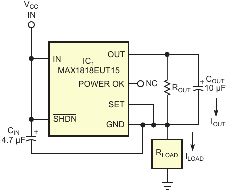 Figure 1. This high-side constant-current source delivers load current of 2.5 V divided by the output resistance, provided that you choose the output resistance to ensure that the voltage between the regulator's input and ground terminals is at least 2.5 V