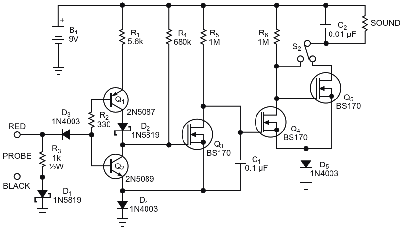 This simple continuity tester is switch-selectable to sound on either shorts or opens. It prevents a user from accidentally connecting it across live circuits