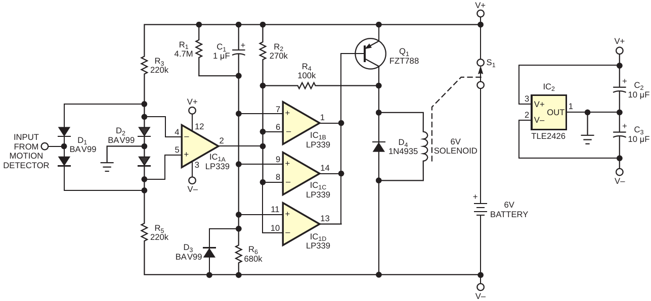 This motion-detector circuit works with 6 V battery voltages that sag as low as 2 V