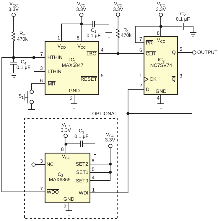 Figure 2. Repeatedly pressing the circuit's momentary-contact switch toggles the circuit's output on and off. After a preselected interval, an optional watchdog timer resets the output to the logic-low state
