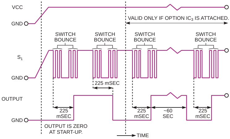 Figure 2. Repeatedly pressing the circuit's momentary-contact switch toggles the circuit's output on and off. After a preselected interval, an optional watchdog timer resets the output to the logic-low state
