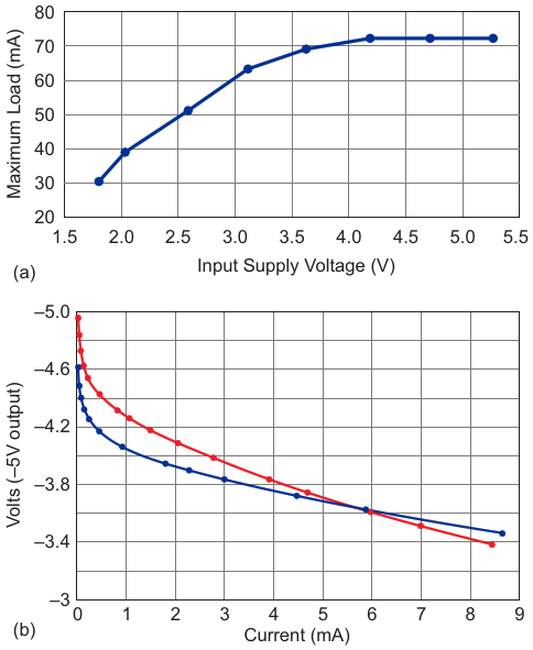 Figure 2. With auxiliary rails unloaded, the 5 V output's maximum available load current rises with input supply voltage (a). The auxiliary-output voltage levels depend on the load current (b)