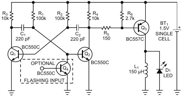 This simple astable multivibrator provides a low-cost way to drive an LED from a single cell