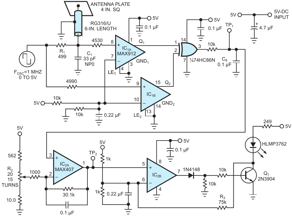 Figure 1. This proximity detector lights the LED when a person approaches the antenna plate within a threshold distance set by potentiometer R