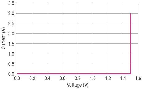 Current versus voltage for circuit in Figure 1, high current, note the square knee