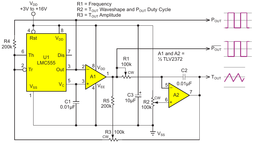 555 triangle generator with adjustable frequency, waveshape, and amplitude; and more!