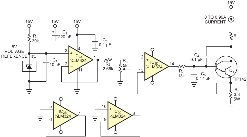 A voltage reference and two op amps provide a stable voltage to R