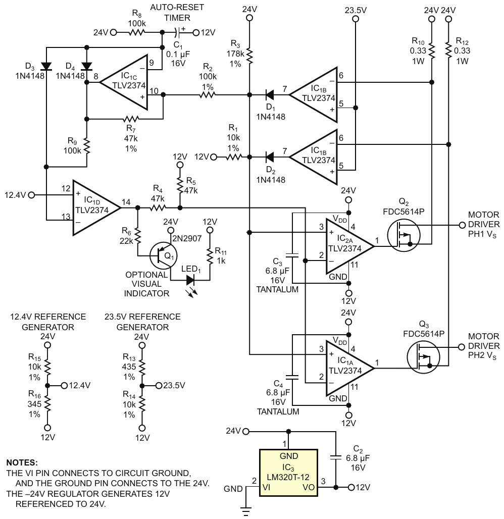 Current-sense resistors turn off MOSFETs when current through them exceeds a limit