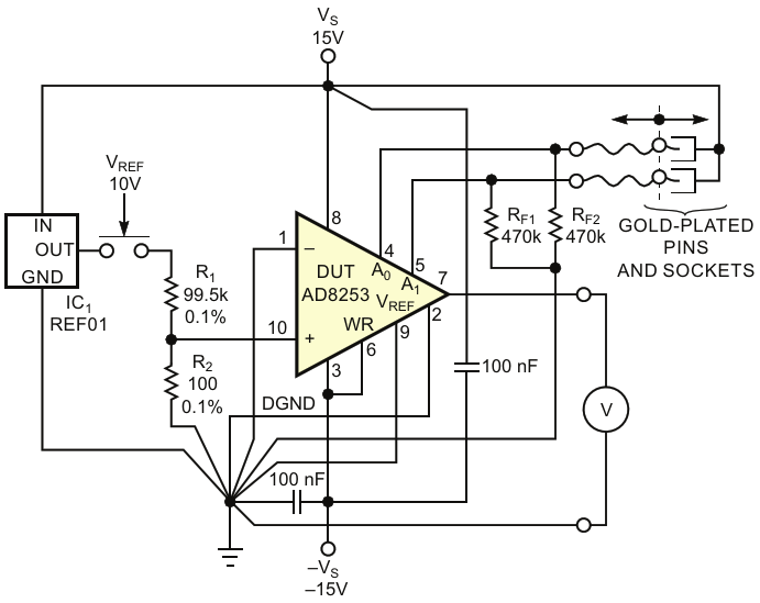 Comprising a handful of components, this circuit allows you to perform your own, independent testing of basic static properties of digitally gain-programmable amplifiers