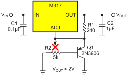 Figure 4. Failsafe circuits with a negative regulator need an NPN Q1