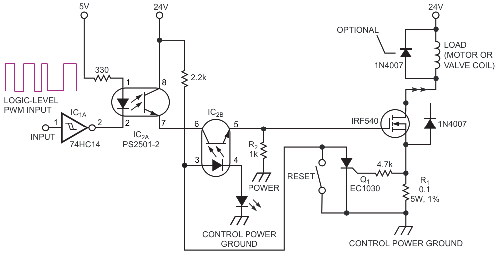 An overcurrent condition in this isolated PWM driver turns on SCR Q