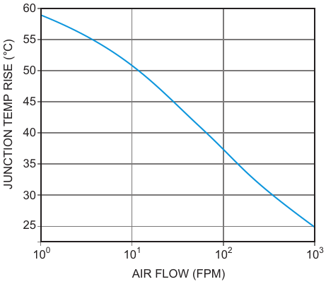 Figure 1. The TO-92 junction temperature delta versus air speed at 320 mW showing the nonlinear relationship between airflow and sensor temperature