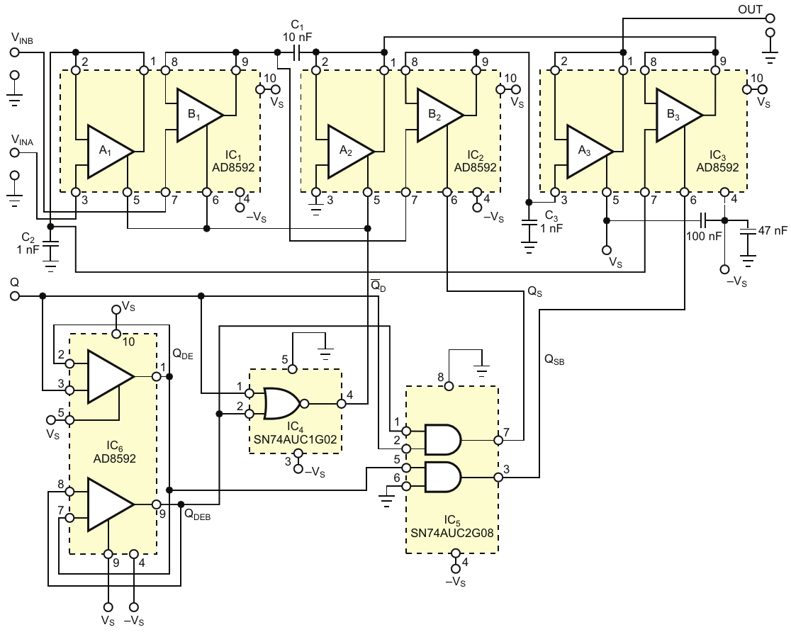 Figure 1. The basis of the operation of this circuit is the simultaneous tracking of the VINA and VINB input voltages on the C2 and C1 capacitors, stacking these capacitors within the sample interval, and storing the valu