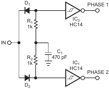 Figure 1. Each Schmitt trigger inverter is driven during one half-cycle through a diode. The RC delay occurs during the alternate half-cycle. Equal-value resistors R1 and R2 serve alternatively as delay elements and gate-coupling resistors