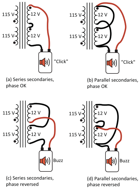 Shown are some of the tests that the continuity tester can make on a dual-primary/ dual-secondary transformer without having to connect it to the mains