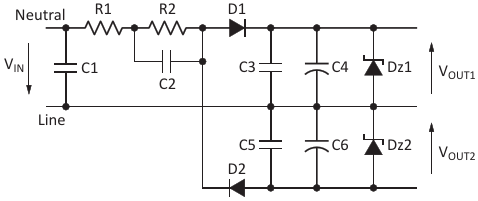 Figure 1. The basic capacitive converter uses a diode rectification, Zener diodes, and capacitors but has no regulation