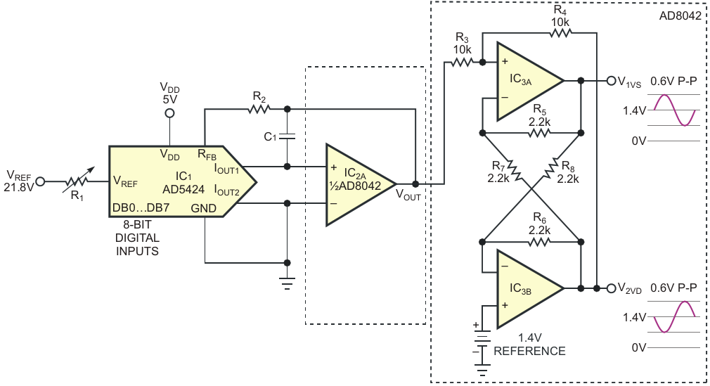 This basic circuit combines a current-output DAC, IC1, with a single-ended-to-differential op-amp stage - IC2, IC3A, and IC3B - to generate the desired outputs