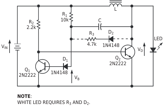 This circuit delivers virtually constant luminosity for a white or a yellow LED