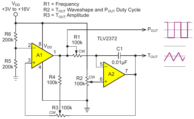 Dual RRIO op amp makes buffered and adjustable triangles and square waves