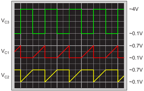 Figure 2. C1 provides oscillation-provoking positive feedback by bypassing Q2, as revealed by Q1 and Q2 collector waveforms
