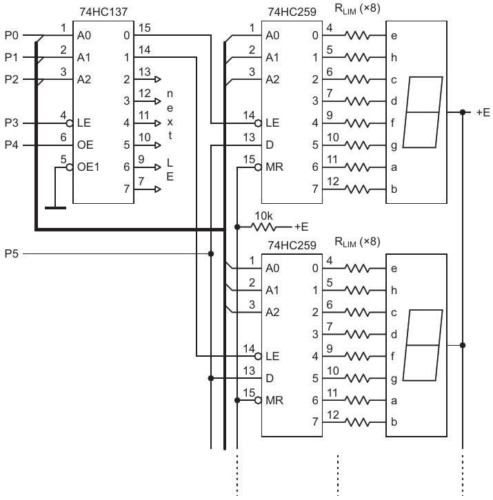 The expandable LED display for a microcontroller has a relatively simple interface with only 6 data/ control wires