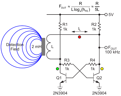 Figure 1. Cross-couple flip-flop outputs with a choke to make an oscillator with period proportional to inductance and thus a simple sensor of metallic objects